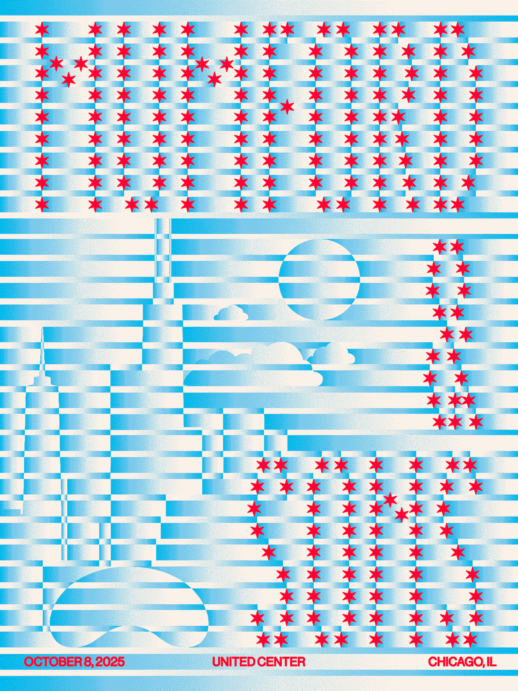 poster for the Mumford & Sons show at the United Center in Chicago, IL on October 8, 2025. the design is a gradient stripe rendering of the Chicago skyline & landmarks.