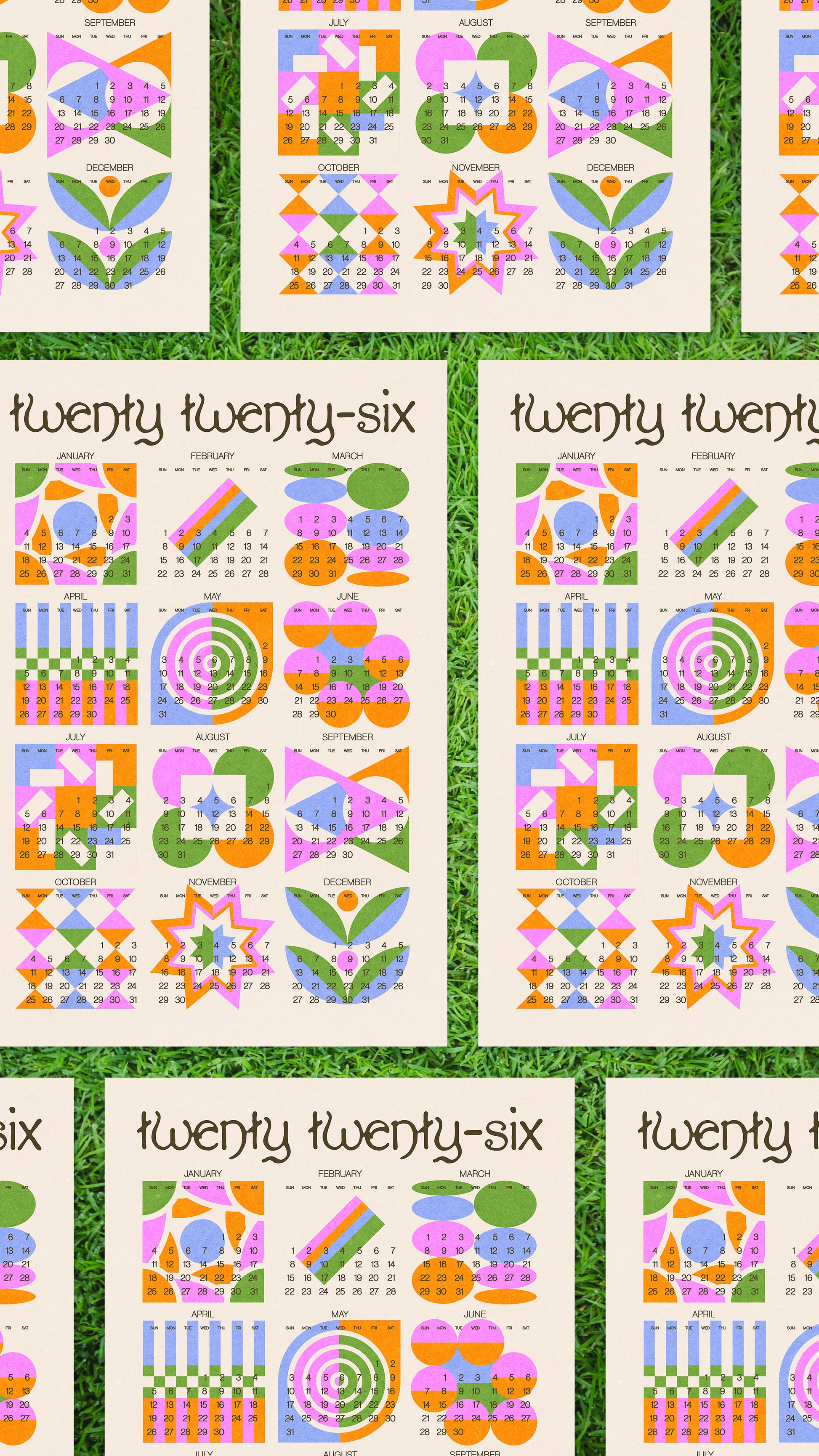 the twenty twenty-six calendar—one-sheet risograph-inspired design on archival matte paper. perfect for home, studio, or workspace décor.